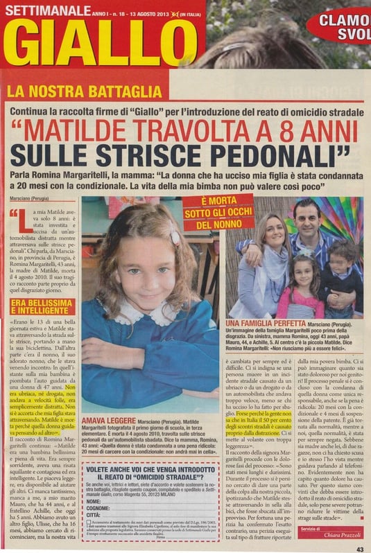 Linea Gialla, la trasmissione di Salvo Sottile che andava in onda su LA7, il 28 Gennaio 2014 dedica ampio spazio alle tragedie sulla strada ed all'omicidio stradale: questo è il breve servizio di apertura.